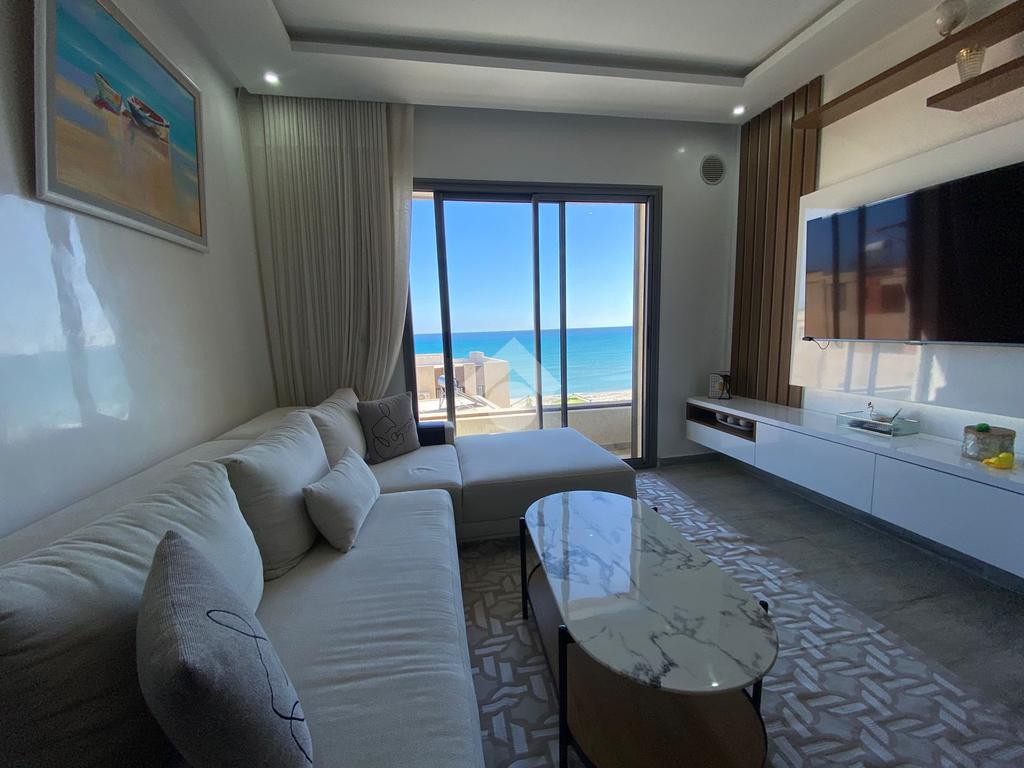 Dès l’entrée, on découvre un salon lumineux grâce à son accès à un balcon avec vue sur la mer, ainsi qu’une cuisine américaine entièrement équipée.
